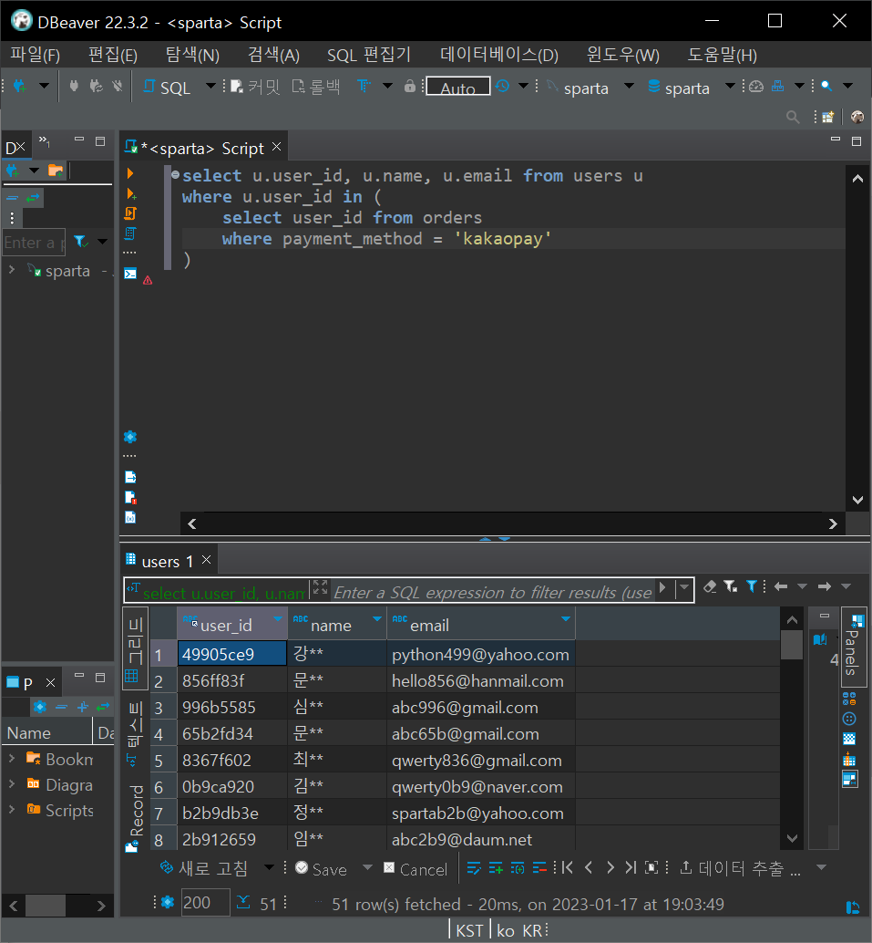 ex. kakaopay로 결제한 유저들의 정보 보기(users테이블과 orders테이블 참고)
