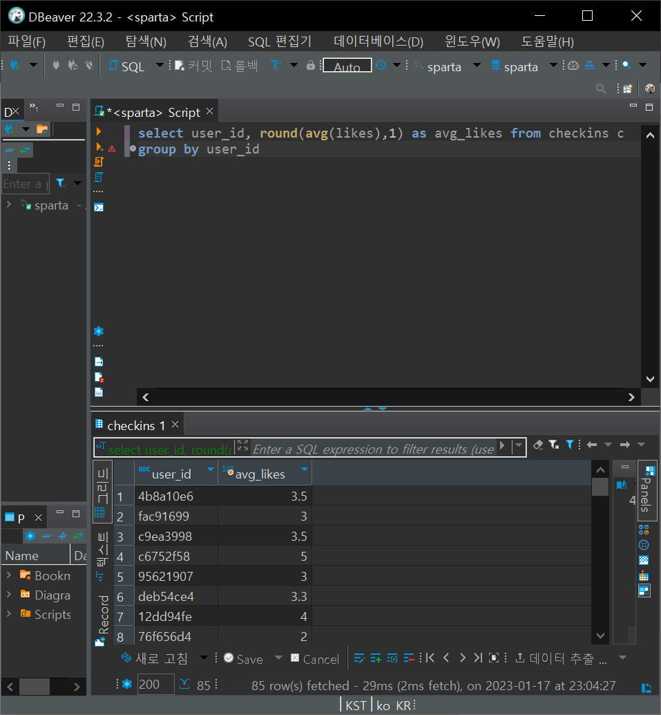 : 유저 별 좋아요 평균이니까 group by로 user_id를 묶고 avg(likes)를 구함.