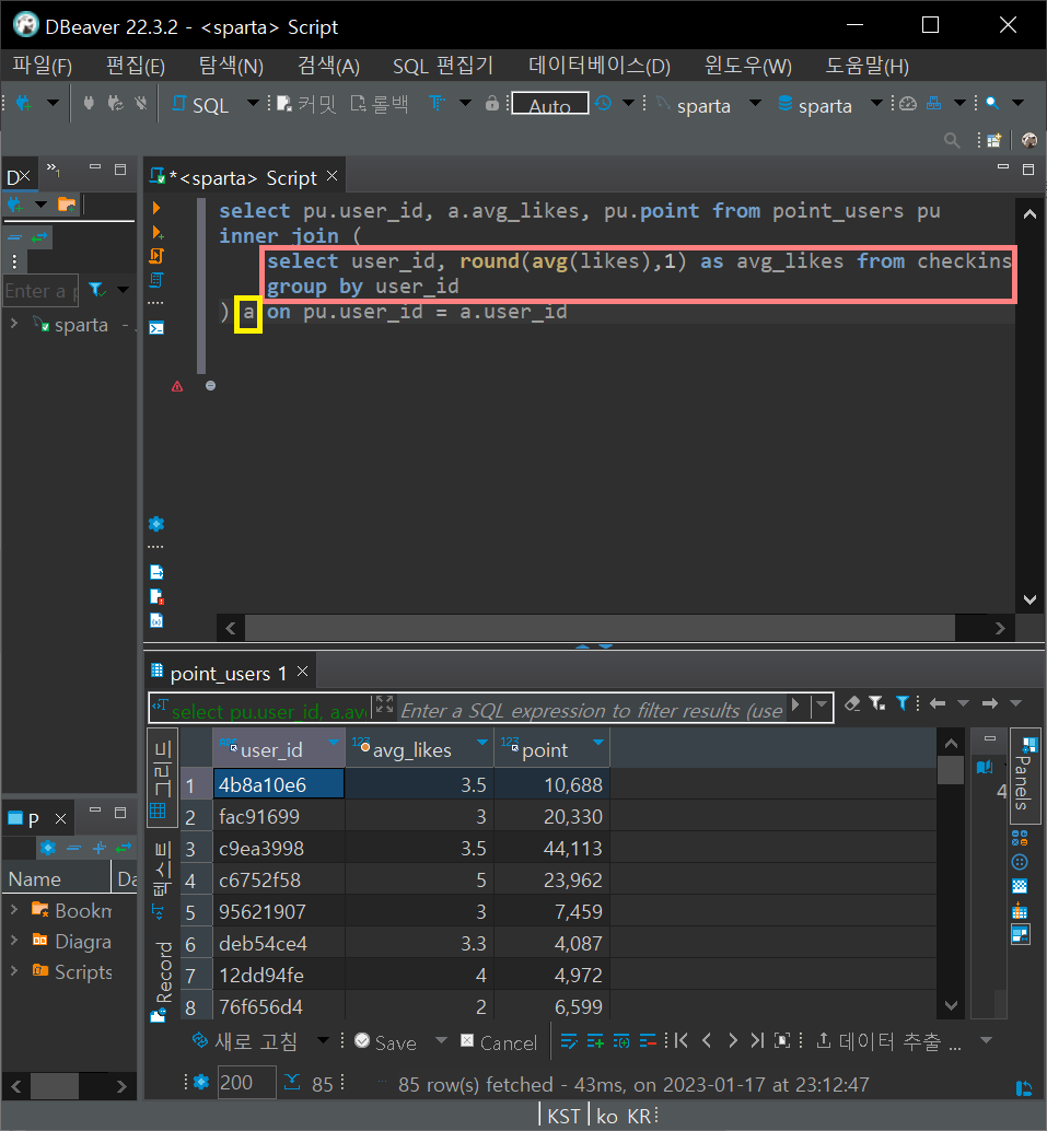 : a테이블을 point_users 테이블에 Inner Join 해주고, Select문으로 필요한 필드 출력.