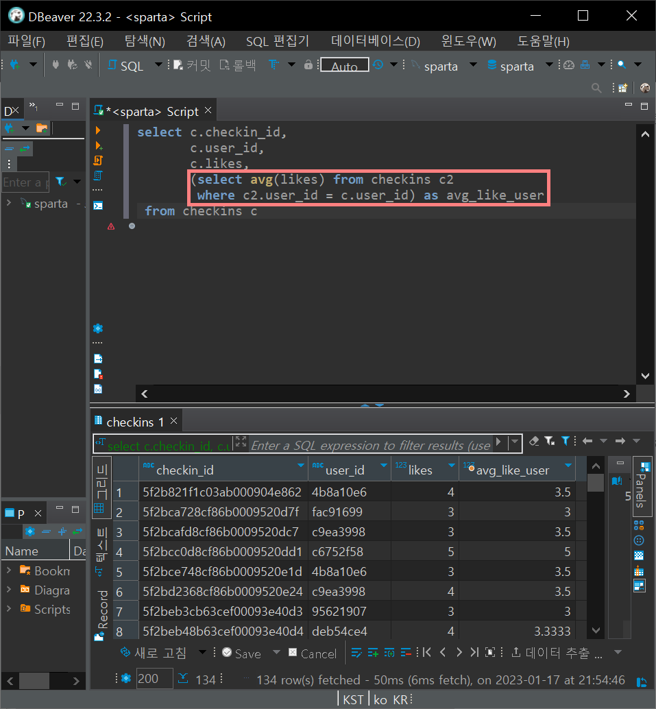 2) 1번의 평균 좋아요 구하는 식을 일반화한 후에 바깥 Select문의 서브쿼리로 넣기.
