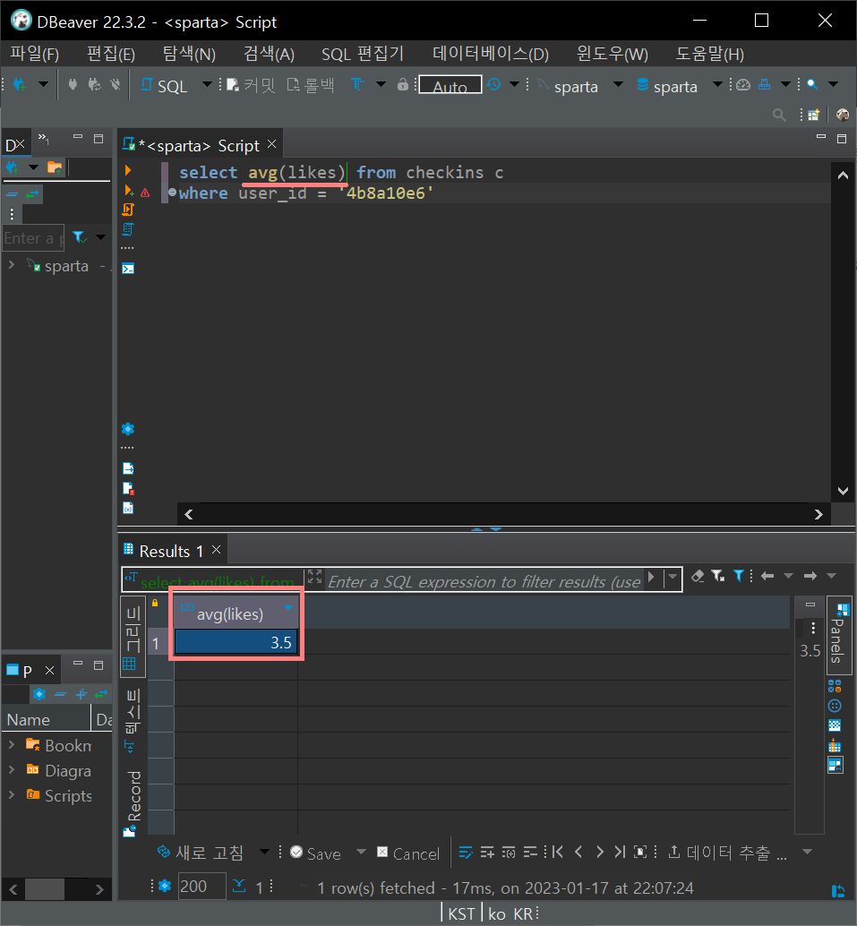 : 이것을 평균은 avg(likes)로 구하면 3.5가 나와야 함.