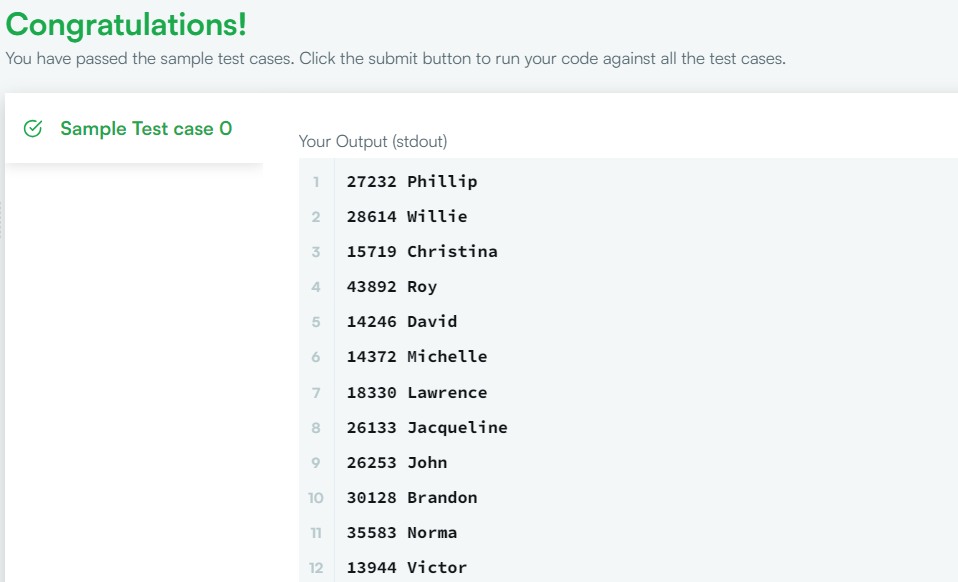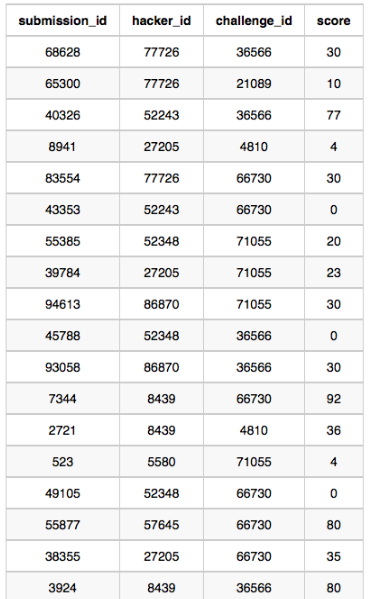 - If more than one hacker received full scores in same number of challenges, then sort them by ascending hacker_id.