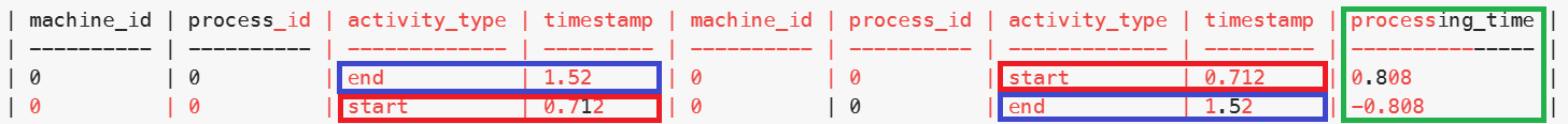 하나의 machine_id와 process_id 별 start 시간과 end 시간을 표현할 때 두 행을 사용하고 있음.