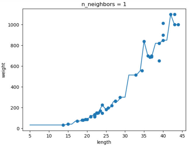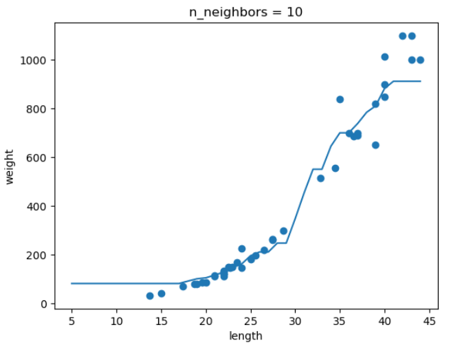 >> 이 모델이 테스트세트와 추가될 농어 데이터에도 일반화를 잘 하리라 예상