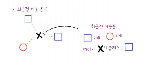 >> k=3(샘플이 3개) 이라 가정하면 사각형이 2개로 다수이기 때문에 새로운 샘플 X의 클래스는 사각형이 됨