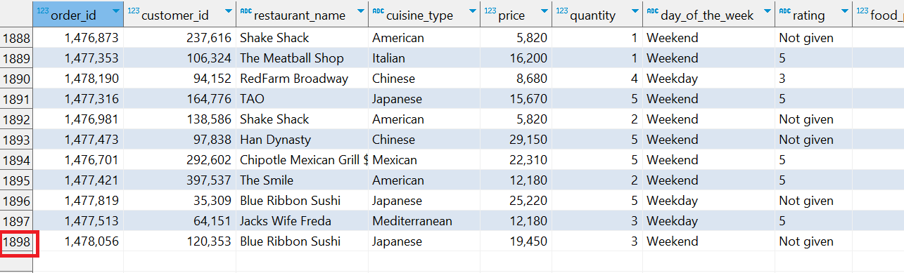 - 컬럼: restauratn_name / cuisine_type / price / quantity / day_of_the_week / rating / food_preparation / delivery_time 등