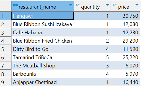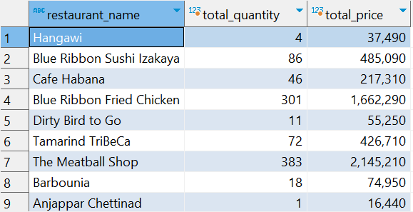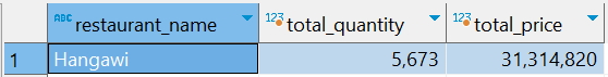>> 음식점 명 별 주문수량과 가격의 합계가 잘 조회된 것을 볼 수 있음.