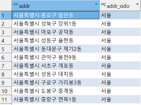 문제1) 서울 음식점들의 주소를 전체가 아닌 '시도'만 나오도록 수정