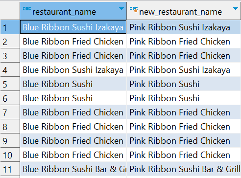 REPLACE(restaurant_name, 'Blue', 'Pink') new_restaurant_name