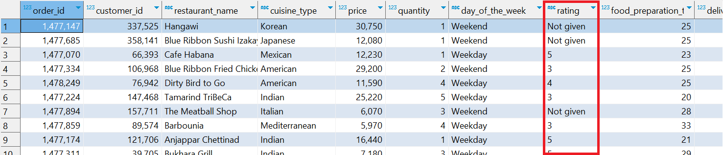 ▶ 원본 데이터의 rating 컬럼 값에 'Not given'이라는 값이 있음
